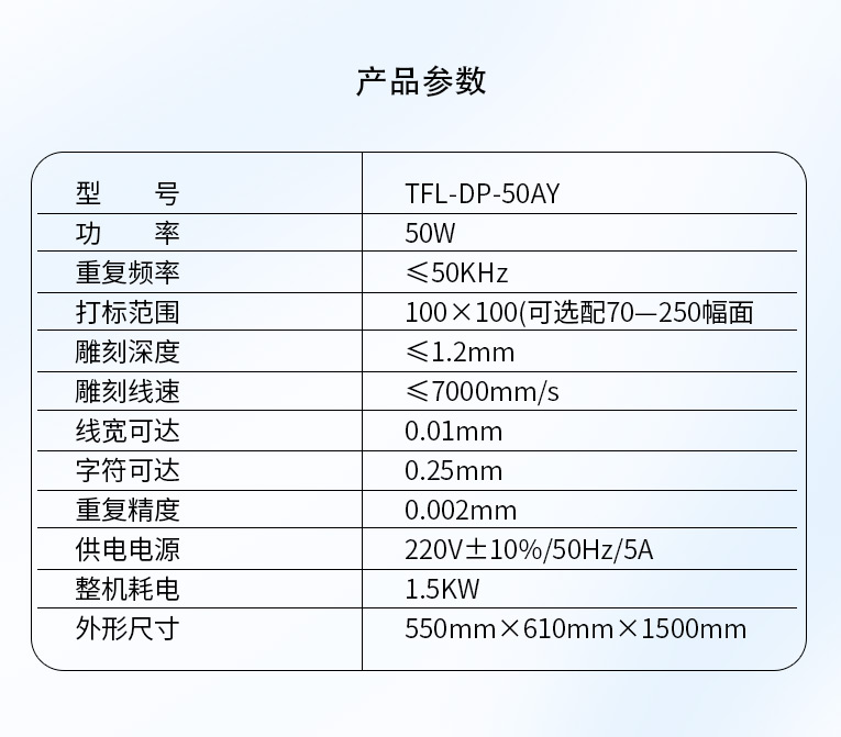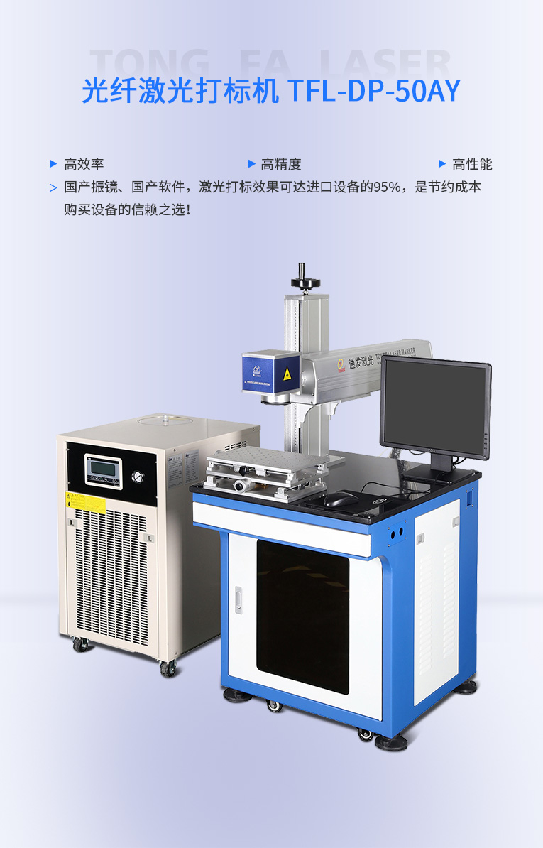 通發激光研發TFL-DP-50AY激光打標機,可針對各種金屬,塑膠進行激光打標加工,本激光鐳雕機配置成熟國產激光器,國產振鏡、國產軟件,性價比高,是普通金屬打標機的好選擇!!!